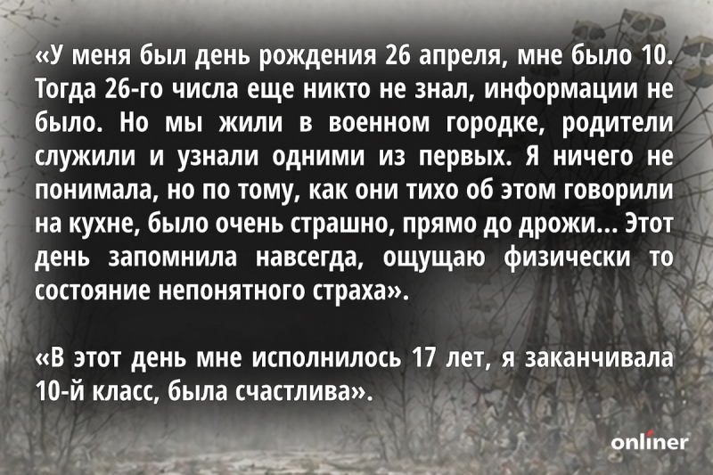 Есть в истории такие дни, которые практически каждый может вспомнить в мельчайших деталях. Один из них — 26 апреля 1986 года, да и весь конец того апреля в целом. За 40 лет, прошедших с момента трагедии, мы привыкли с горечью слышать ужасающие рассказы ликвидаторов аварии на Чернобыльской АЭС. Но как этот период проживали самые обычные белорусы? Ведь так или иначе это событие затронуло абсолютно каждого жителя страны. Мы решили расспросить читателей Onlíner об их воспоминаниях о весне 86-го — и вот какой калейдоскоп историй из этого получился.
